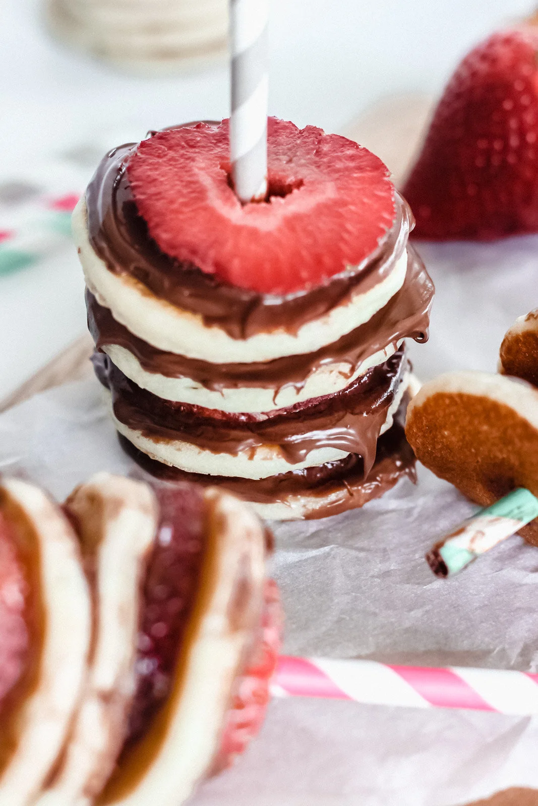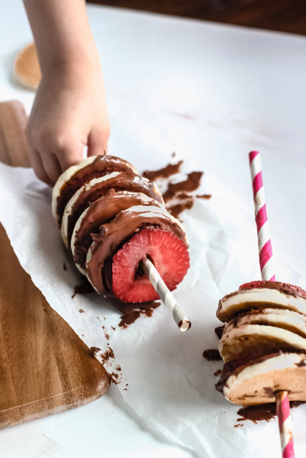 Assembly: First, spread nutella layer onto mini pancakes. Then stack nutella covered pancakes and strawberries on your straw.